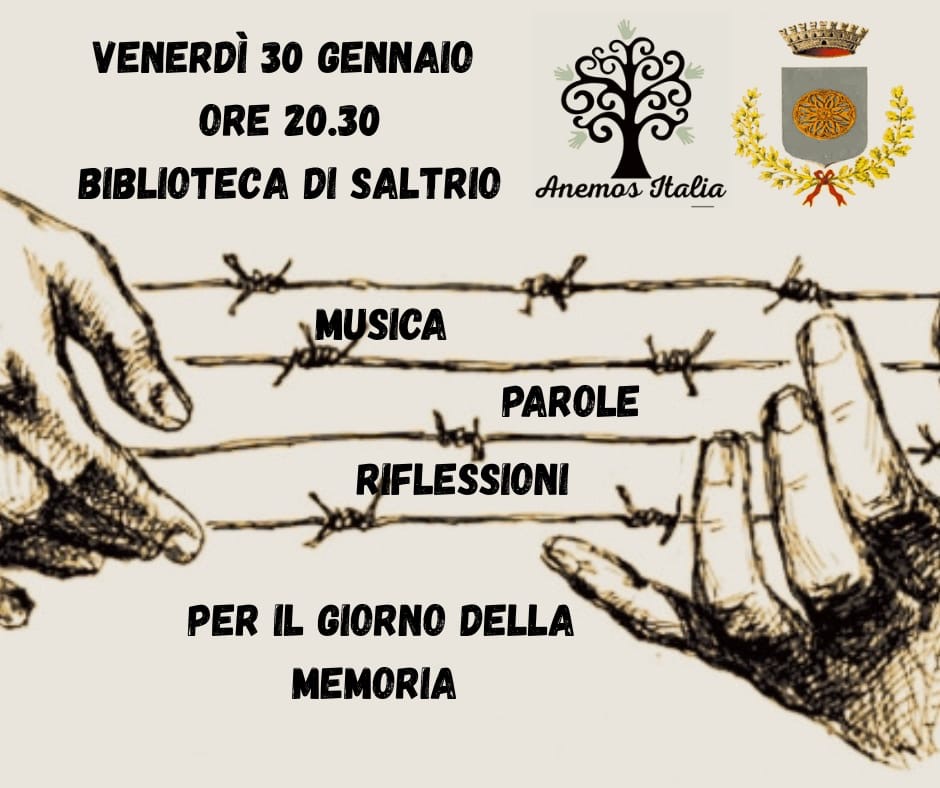 L'Assessorato alla Cultura è lieto di presentare l’iniziativa organizzata dall’Associazione Anemos Italia “Musica, parole, riflessioni per il Giorno della Memoria”, che prevede momenti di musica e di riflessione, attraverso la condivisione di studi scientifici degli anni successivi all’olocausto, che si svolgerà il giorno venerdì 30 gennaio 2026, alle ore 20.30 presso la Biblioteca Comunale di Saltrio.
